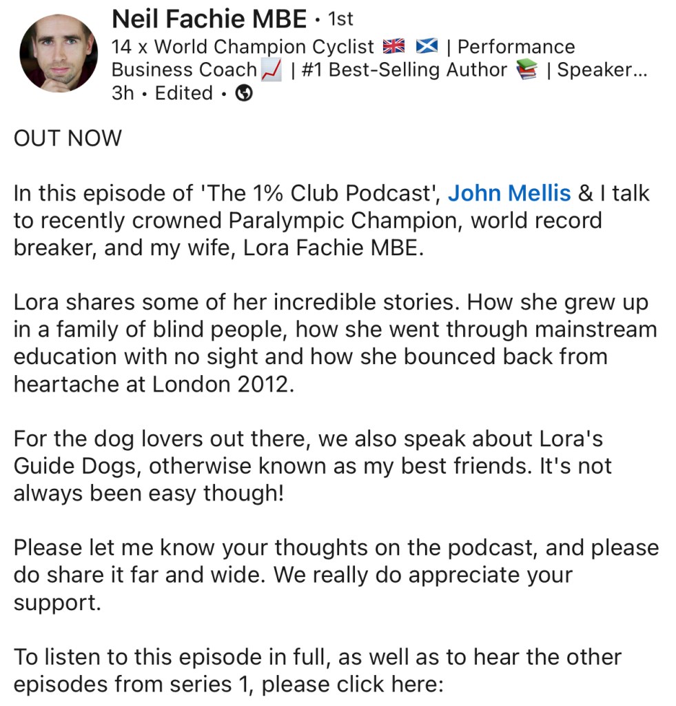 When we launched The 1% Club Podcast, the week the Paralympics opened, all throughout that Summer of recording we’d had to fit in episodes around other work commitments on my part, and training to win yet another Gold Medal, on Neil’s.